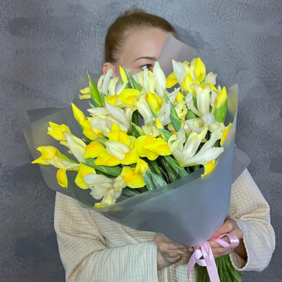 На фото букет из 33 желтых ирисов. В составе: ирис 33 шт, дизайнерская упаковка 2 шт, атласная лента 2 шт, . Все цветы свежие и ароматные, букет красиво оформлен и отлично подходит для подарка. Доступна доставка цветов или самовывоз.